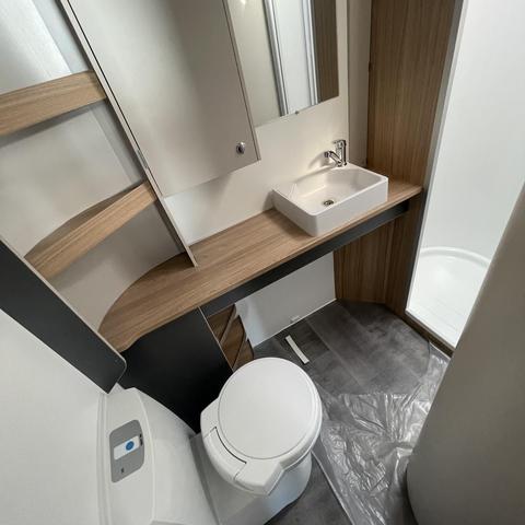 Large panoramic windows enhance the interior with natural light and offer beautiful views of your surroundings, allowing you to enjoy the beauty of nature from the comfort of your caravan.