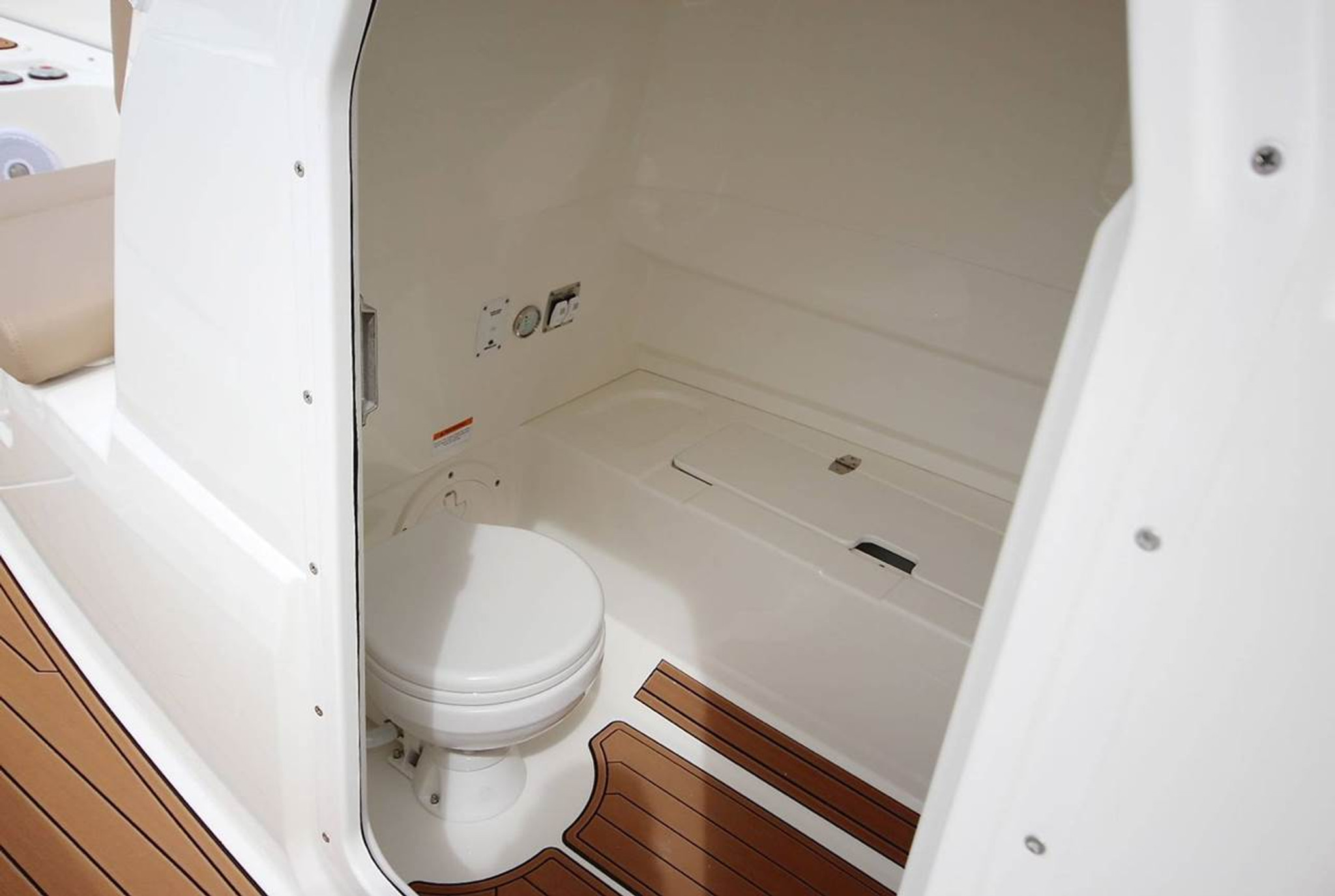 The Eagle 8 is a well-equipped family cruiser that was clearly designed with both captains and passengers in mind. The boat features an extended bow that can be outfitted with a nicely-sized sundeck or another seating area. A foldable ladder that has a convenient platform makes getting in and out of the water a breeze even for younger boaters. Washing off is just as easy thanks to the boat’s freshwater shower or washdown area.